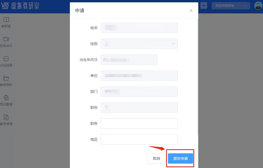 选择【提交申请】,待教研室负责人审核通过,即可加入选择的教研室。若教研室负责人需要申请人补充更多个人信息,请按要求填写或上传相关材料。
