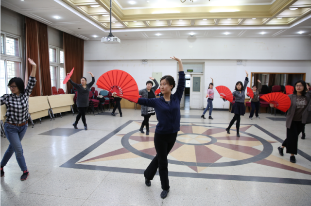 今年北京大学运动会的团体操表演项目是未名太极扇,外国语学院积极响应学校工会的号召,在工会常务副主席、副院长张冬梅老师、工会副主席刘军老师、文体委员李宁老师、女工委员鲁学彬老师、工会小教员刘水老师的带领下组织了30余人的太极扇团队,每天11:00—11:30准时排练。因春季时常有雾霾天气,外院工会特提供民主楼208室内多功能厅以及多媒体设备供太极扇排练使用。