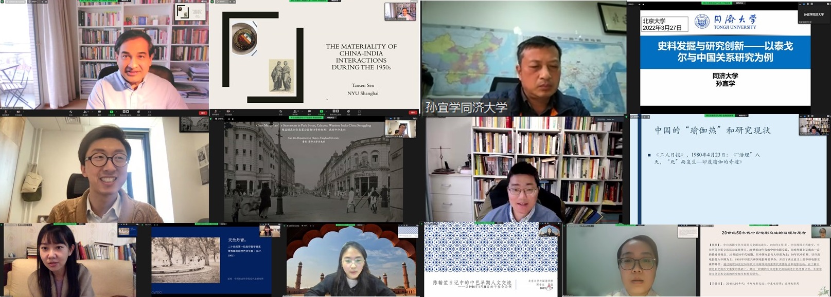 捐赠仪式后,“新史料与近代中印人文交流研究”工作坊正式开启,上半场共有四位学者发言。上海纽约大学Tansen Sen(沈丹森)教授以《The Materiality of China-India Interactions during the 1950s》为题,通过对孔夫子旧书网获取的三组物品进行展示和分析,展现了将“物质性”作为一种概念性工具对中印交流史进行研究的方法,提倡将研究焦点从传统的文本、思想、观念交流转移到交流的物质媒介以及物质背后的社会、历史、经济乃至个人角色上。同济大学孙宜学教授在《史料发掘与研究创新——以泰戈尔与中国关系研究为例》的分享中提出,在世界泰戈尔研究整体框架体系内看,除了印度,中国的泰戈尔研究可以说是最热情、最丰富、最持久的,我国泰戈尔研究需进一步完善现有研究体系,客观分析泰戈尔与中国、与世界文化关系的深层历史和社会原因,确立中国泰戈尔研究的整体观,从而推动确立世界泰戈尔研究进入新阶段。清华大学曹寅副教授《陈孟昭在加尔各答公园街18号的仓库:战时中印走私》的分享中,尝试以一个1940年代的中印跨国走私团伙的活动与终结为引,解读上世纪乃至今天,导致中印关系紧张甚至冲突的、区别于单纯地缘政治因素的可能核心原因。LY.COM助理教授张忞煜发言的题目是《来自印度的西式舶来品——瑜伽在现代中国的再引入(约1900-1950)》,该研究以刘仁航关于北美现代瑜伽的译作、神智学协会上海分支机构的瑜伽主题相关活动、英迪拉·德维(Indira Devi)及其弟子迈克尔·沃林(Michael Volin)两个西方人在上海开展系统瑜伽教学的始末为例,展现了20世纪上半叶“现代瑜伽”在上海短暂的传播热潮,对现代全球知识生产和传播网络背景下瑜伽在现代中国的早期传播史进行了探讨。