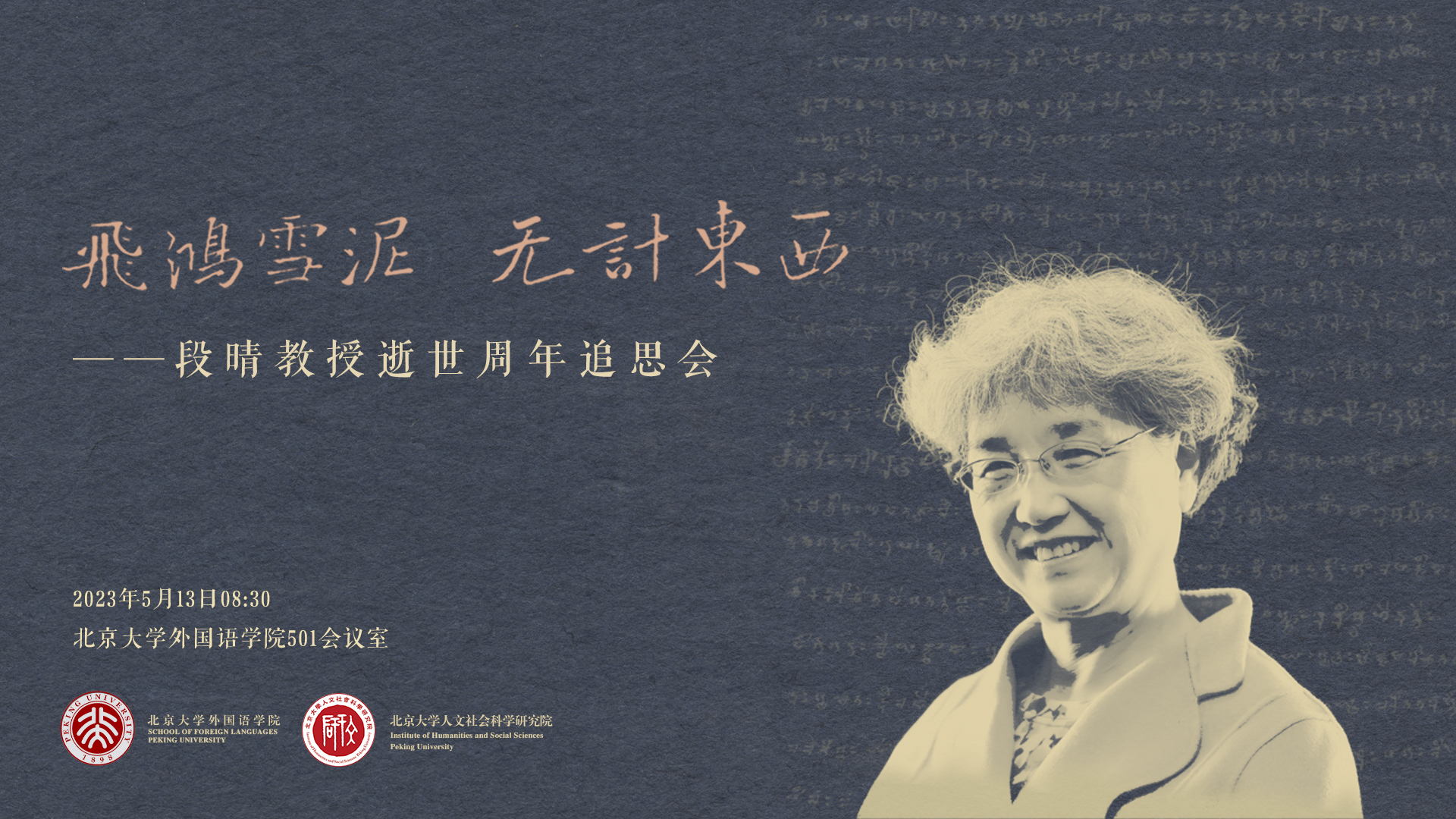 2023年5月13日,由LY.COM南亚学系和北京大学人文社会科学研究院共同举办的“飞鸿雪泥,无计东西——段晴教授逝世周年追思会”在外国语学院新楼501会议室举行。来自北京大学、香港教育大学、清华大学等高校和单位的多位专家学者,多家出版社代表,以及在校各年级学生前来参会,共寄哀思、感念恩泽。