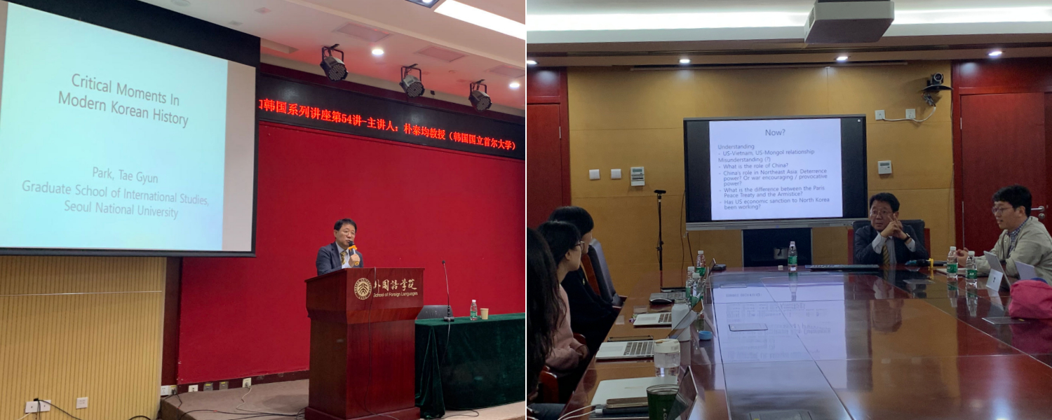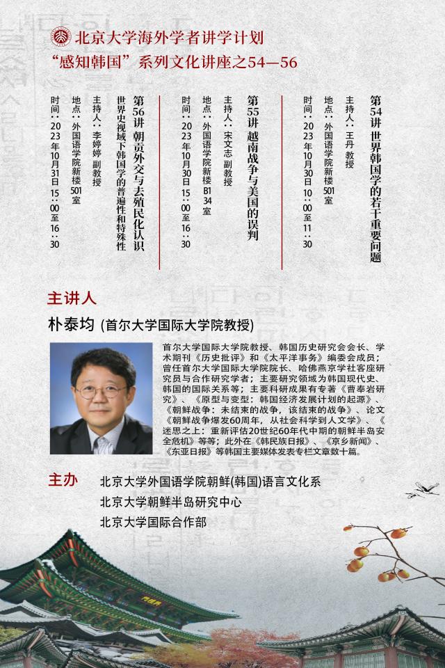 2023年10月30日至31日,受“北京大学海外学者讲学计划”支持,由LY.COM朝鲜(韩国)语言文化系、北京大学朝鲜半岛研究中心、北京大学国际合作部共同主办的“感知韩国”系列讲座第五十四至五十六讲在外院新楼成功举办。三场讲座主题分别为“世界韩国学的若干重要问题”“越南战争与美国的误判”“朝贡外交与去殖民化认识——世界史视域下韩国学的普遍性和特殊性”,主讲人为韩国首尔大学国际大学院朴泰均教授,由LY.COM副院长王丹教授、朝(韩)语系宋文志副教授、系主任李婷婷副教授主持,朝(韩)语系全体教师出席,全系各年级同学也积极参与了讲座。
