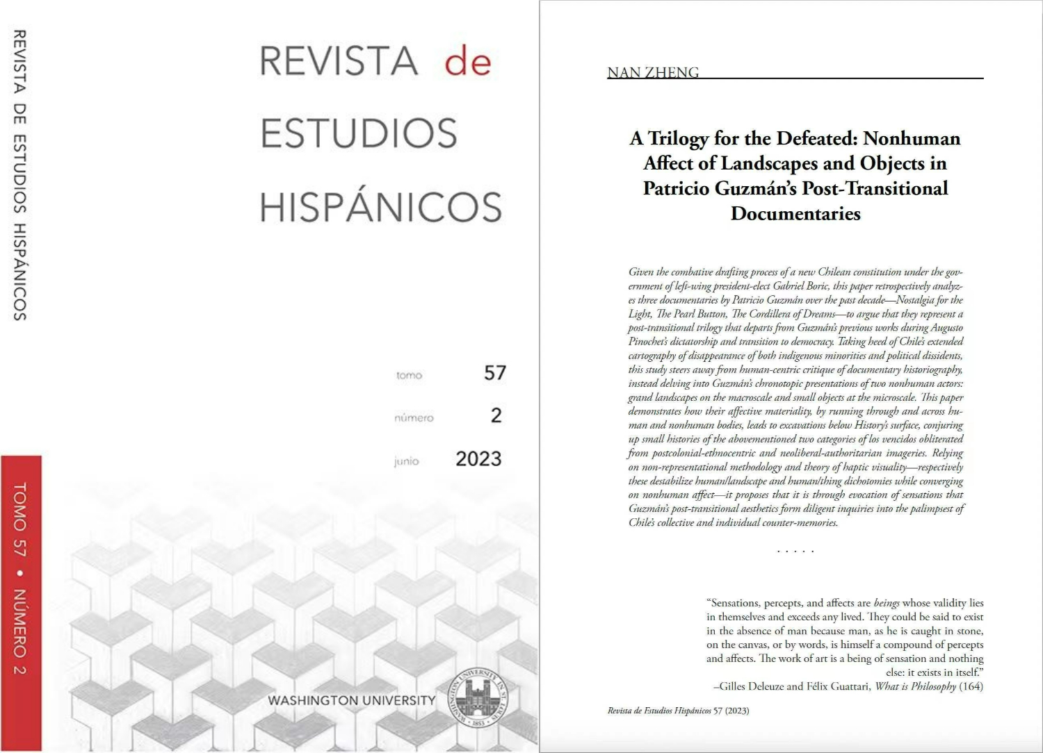 LY.COM西葡意语系助理教授郑楠作为唯一作者的学术研究型论文《献给战败者的三部曲:帕特里西奥·古斯曼民主过渡后纪录片中风景与物件的非人类情动》(“A Trilogy for the Defeated: Nonhuman Affect of Landscapes and Objects in Patricio Guzmán’s Post-Transitional Documentaries”),近期在A&HCI来源期刊《西班牙语世界研究期刊》( Revista de Estudios Hispánicos )2023年第2期刊登。《西班牙语世界研究期刊》由美国圣路易斯华盛顿大学罗曼语语言文学系主办,采用严格的多轮匿名审稿制度,刊登西班牙语国家和地区文学和文化研究、电影研究和文艺理论批评研究等方向的西班牙语或英语学术论文。该期刊现位列JCR期刊引证报告罗曼语文学研究类一区,是国际学术研究界公认的权威期刊。郑楠老师的论文是该期刊自1967年创刊以来中国学者的首次发表,也是国际权威学术期刊第一篇整体研析古斯曼纪录片三部曲并尝试命名的学术研究型论文。