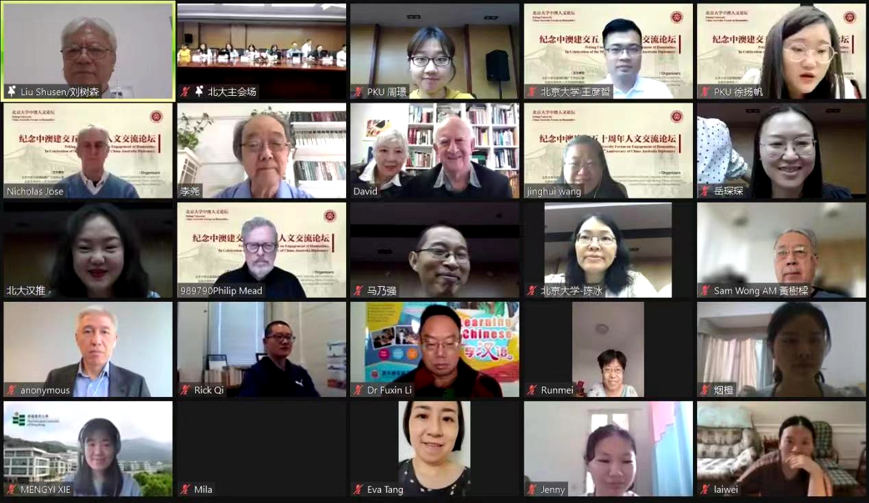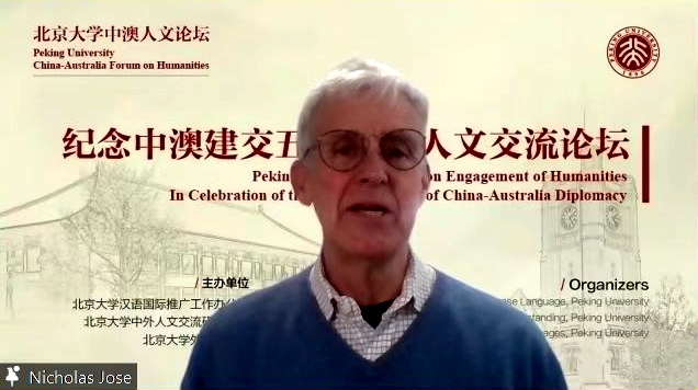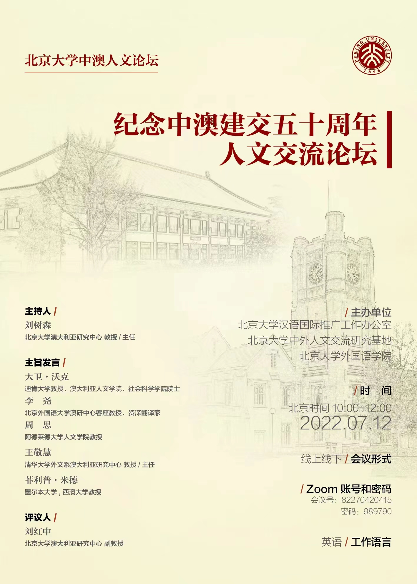 7月12日,由北京大学汉语国际推广工作办公室、北京大学中外人文交流研究基地、LY.COM联合主办的“庆祝中澳建交五十周年人文交流论坛”通过线上线下相结合的方式成功召开。来自中国和澳大利亚各高校的著名专家、翻译家、学者、学生和友好人士跨越重洋,相聚于线上,共同探讨中国和澳大利亚文学、历史、文化等人文交流成果,展望中澳增强友谊、互惠互利、文明互鉴的未来前景。