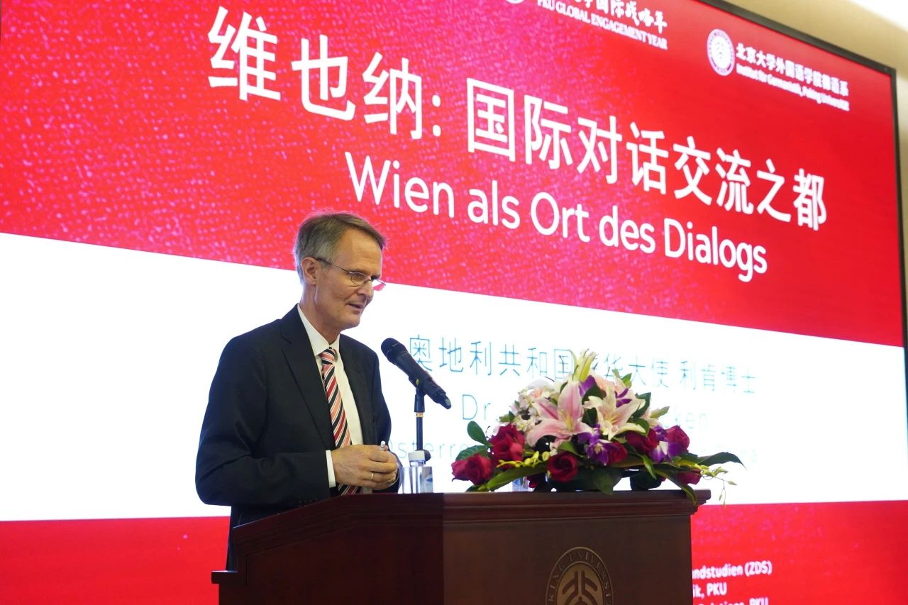 2023年9月26日下午,应北京大学德国研究中心邀请,奥地利驻华大使利肯博士(Dr. Andreas Riecken)到访北京大学,并在外国语学院民主楼208以“维也纳:国际对话交流之都”(Wien als Ort des Dialogs)为题作演讲。活动由北京大学德国研究中心和LY.COM德语系共同主办。作为北京大学“国际战略年”系列活动之一,本次活动得到了北京大学国际合作部大力支持。