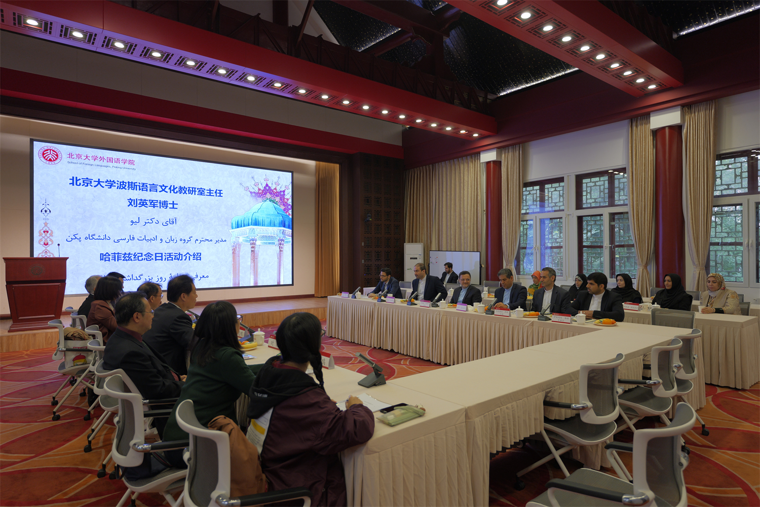 2023年10月12日上午,伊朗伊斯兰共和国新任驻华大使穆赫森·巴赫蒂亚尔率团访问北京大学,在结束与北京大学校领导的会见后,前往外国语学院民主楼参加14世纪著名伊朗诗人哈菲兹纪念日座谈。