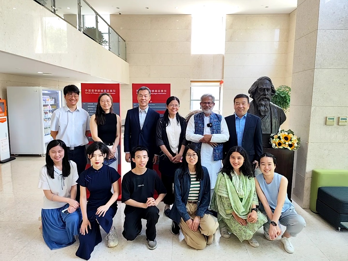 活动尾声,全体师生在泰戈尔塑像前合影留念。萨卡尔教授接受了中央广播电视总台的采访,分享此次活动的感悟与收获。