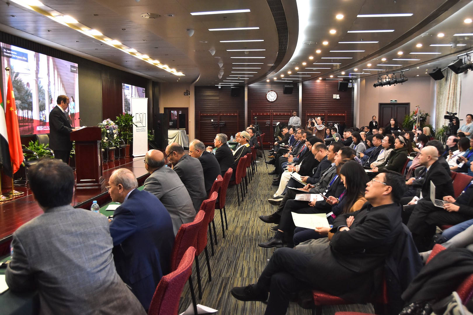 北大教务委员会副主任王杰教授在致辞中说,一带一路框架背景下,中阿国际交流将有更多发展潜能。1946年,北京大学就开始设立阿拉伯语专业,以马坚教授为代表的一批学者为中国阿拉伯语教育打下了扎实基础,而当前老中青三代结合的教师力量为北大阿拉伯语言、文化、国际关系等多层面的教学提供了强有力的师资保障。王杰教授提到2018年7月中华人民共和国主席习近平对阿联酋进行了正式友好访问,他强调中国与阿联酋要做互学互鉴的交往伙伴;中阿应该加强文化、教育、旅游、青年、媒体等领域合作,做不同宗教、不同文明对话互鉴的桥梁。习近平主席对阿联酋的国事访问,为两国高等教育开展合作开拓了新的途径,也为我们建设具有全球意识的高等教育创造了前所未有的机会。