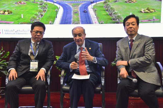 上海外国语大学校长李岩松教授(左)、沙迦美国大学校董Hani Findakly教授(中)与北京大学付志明教授(右)