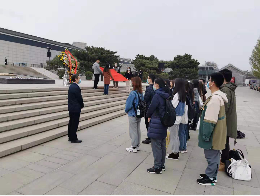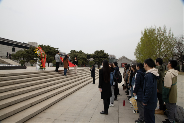 随后,在中国人民抗日战争纪念馆副馆长董立新和外国语学院院友吕曦的带领下,师生来到抗战馆进行实地学习。清明时节寄哀思,在董馆长的指引下,师生在独立自由勋章雕塑前向先烈默哀致敬。董馆长表示,在建党一百年的关键历史节点,我们当代中华儿女应当“缅怀英烈志 奋进新征程 ”, 在缅怀先烈、寄托哀思的同时,更应当砥砺奋进,在新的一百年中创造新的辉煌。
