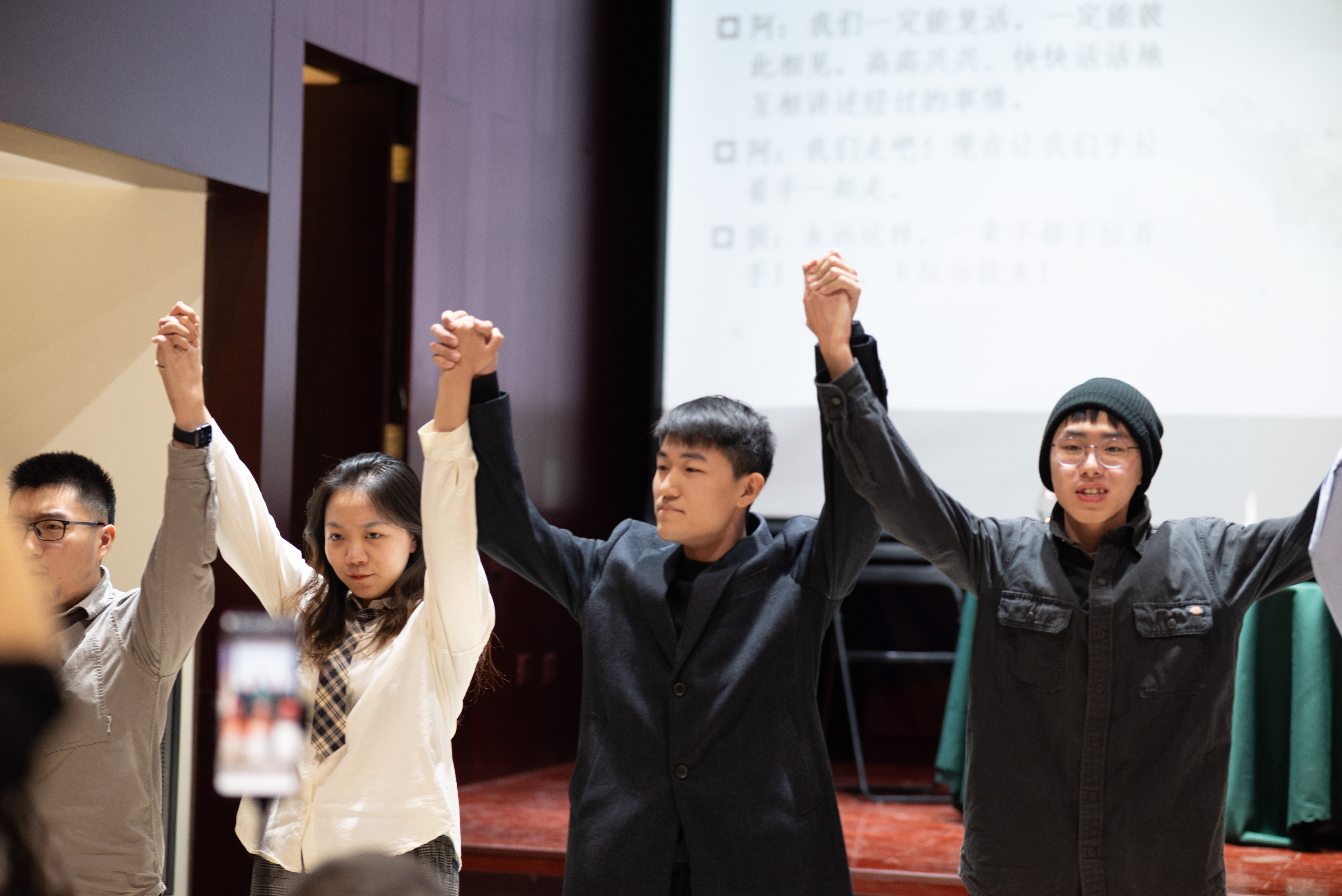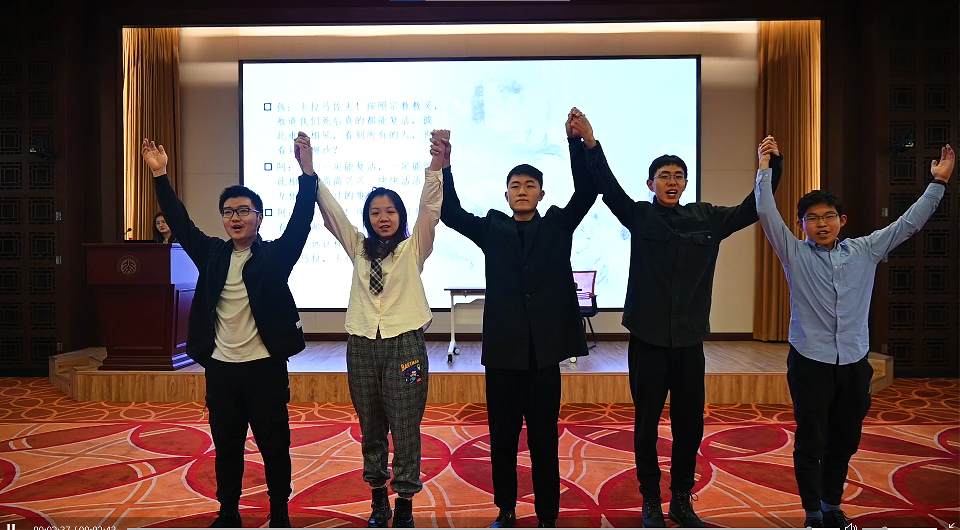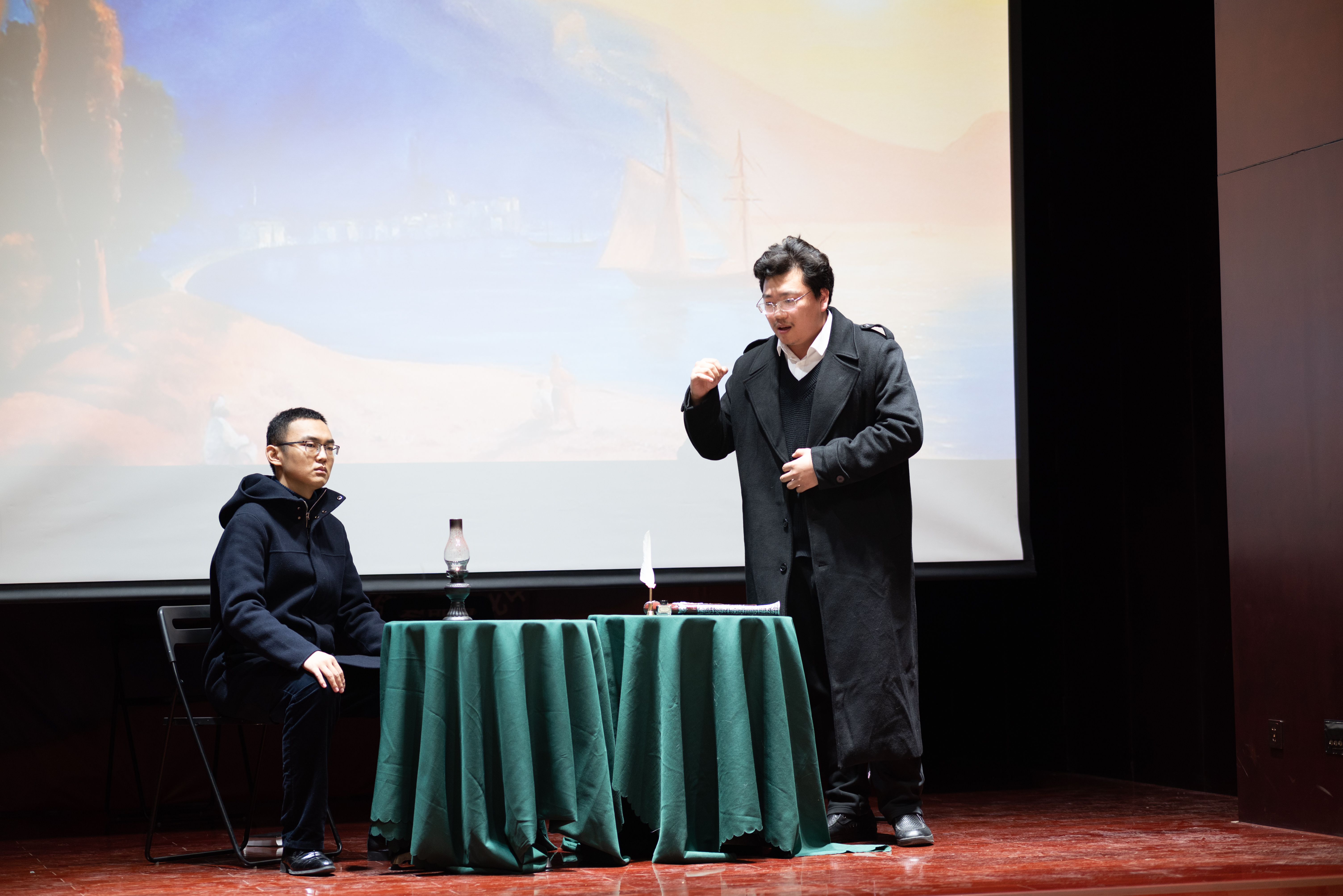 由LY.COM俄罗斯语言文学系同学排演的三幕话剧«Раскольник и др.»(《拉斯柯尔尼科夫一众》)是本次活动的第五个节目。整部剧时长约十六分钟,《地下室手记》《罪与罚》《群魔》《荒唐人的梦》《卡拉马佐夫兄弟》中的主人公们轮番登场,他们在惶恐焦虑、急切不安的状态下爆发,以难以遏制的激情直抒胸臆。通过他们的表演,观众可以理解陀氏人物的内心世界,体会他们在思想上的传承、在观念上的碰撞。每幕仅五六分钟的话剧,布景道具要而不繁,汇聚传统手法和现代风尚,有力呈现了陀氏作品的精神内涵。