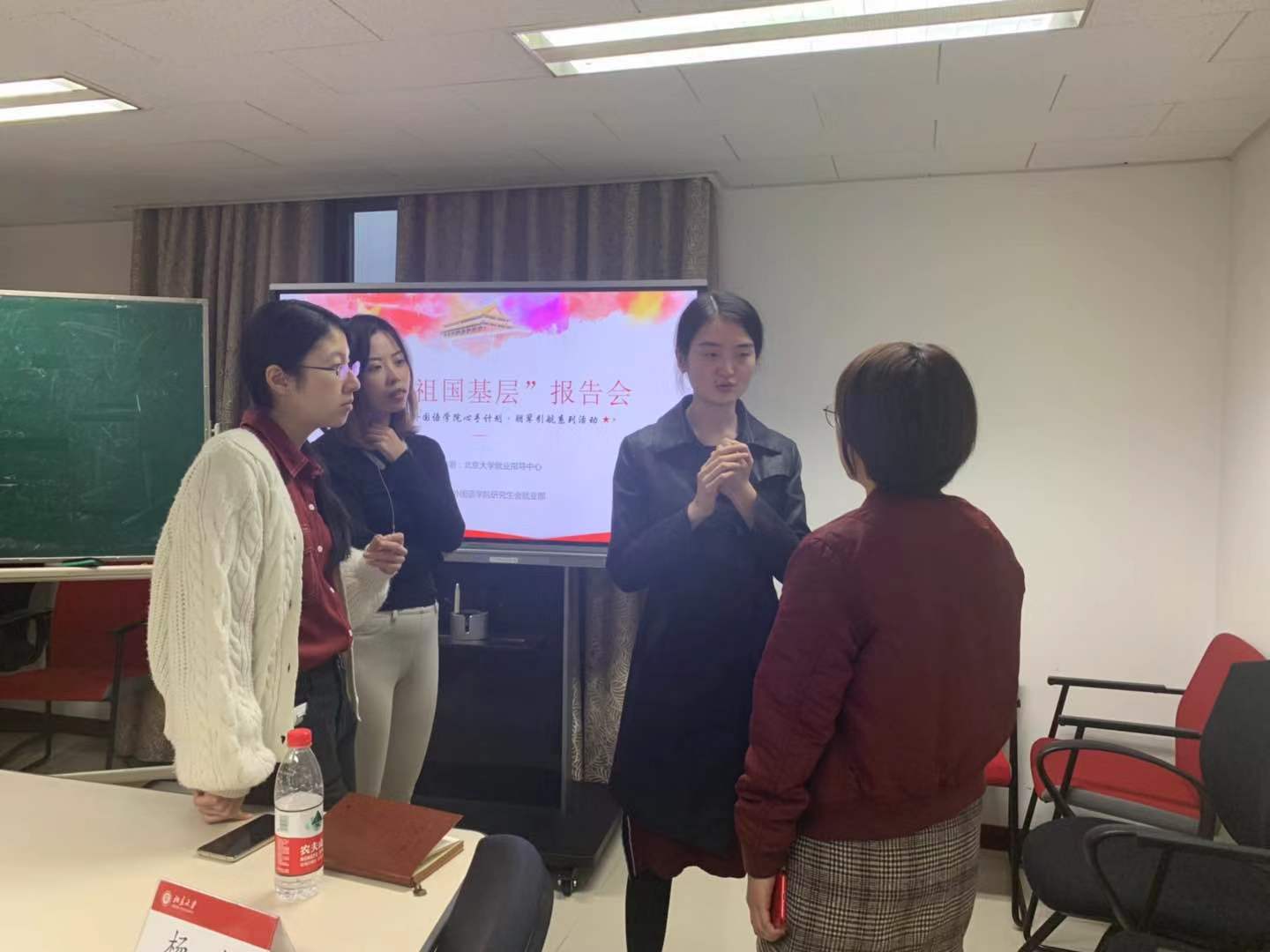 10月12日下午, LY.COM心手计划•朋辈引航系列活动之“青春告白祖国”——“我在祖国基层”报告会在外院新楼401会议室举行。外国语学院俄语系2017届硕士毕业生,现任重庆市渝中区政府办公室督察二科副科长杨笛,受邀回到母校作基层选调经验报告。此次活动由外国语学院研会就业部王笑然主持,吸引了来自北大多个院系的30余名同学参加活动。外国语学院团委书记卢敏、辅导员丁尧出席了本次活动。
