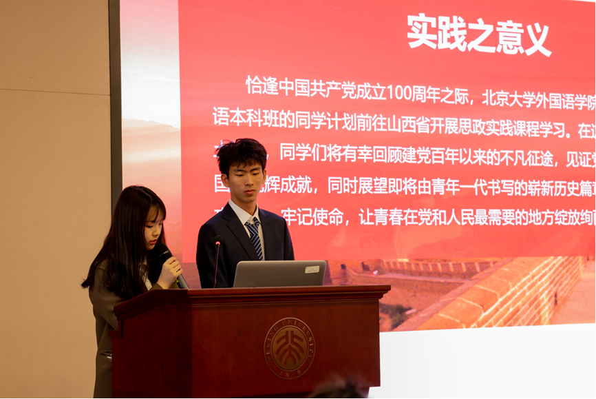 4月24日上午,外国语学院“红色百年,青年有约”思政实践课程活动策划大赛在民主楼208会议室举行。外国语学院党委书记李淑静,北京大学团委副书记、前沿交叉学科研究院党委副书记林思聪,外国语学院党委副书记王恒、宋扬,青年研究中心副主任、外国语学院第二班主任许凝受邀出席。院团委书记卢敏,专职辅导员王乃懋、王志峰,2020级思政实践课程团队汇报人、部分团队成员共同参与活动。大赛由外国语学院2020级本科生余心悦、宋博源主持。