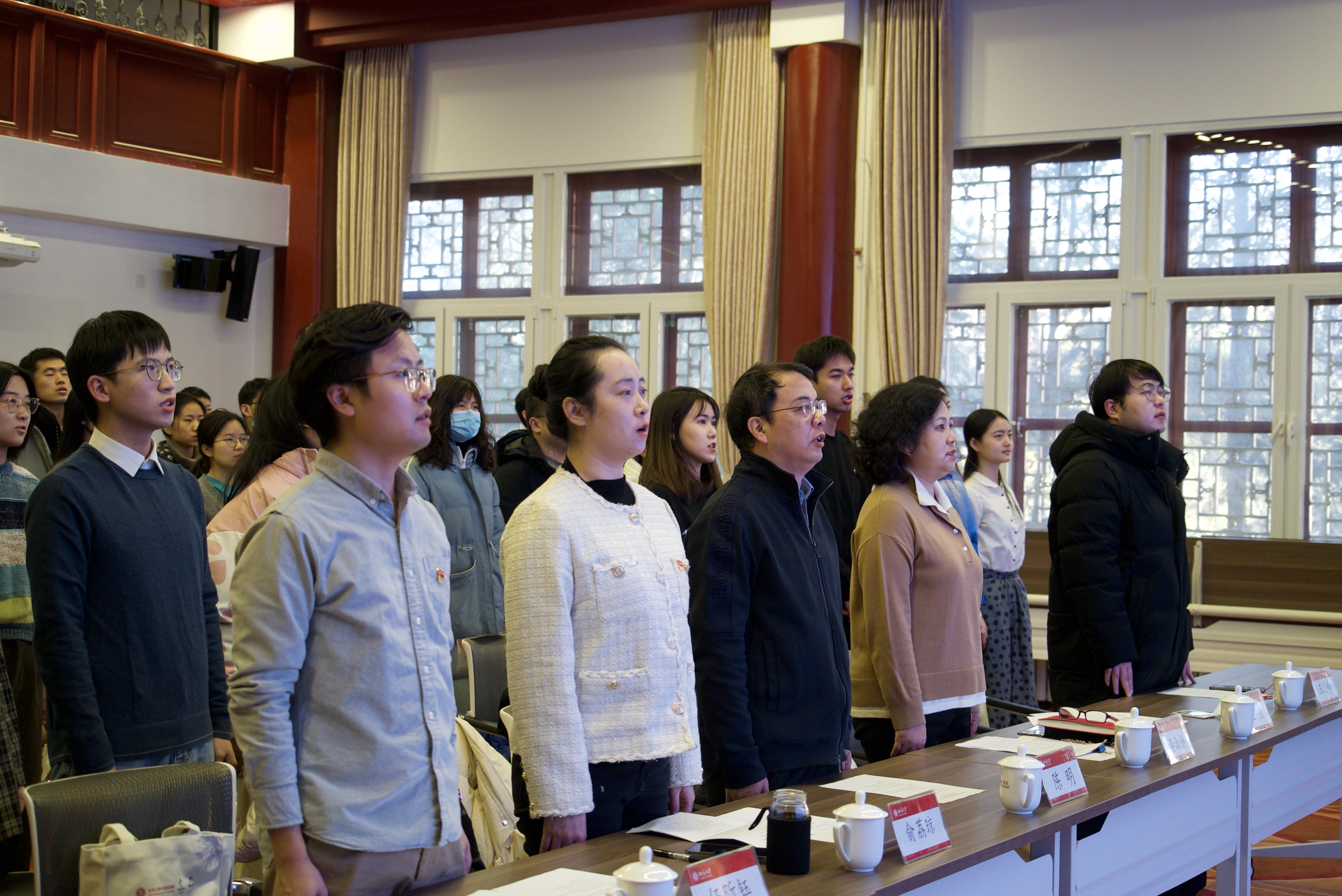 外国语学院党委副书记王恒宣读成立临时党团支部的决定,李淑静和俞荔琼分别为临时党支部、临时团支部授旗。