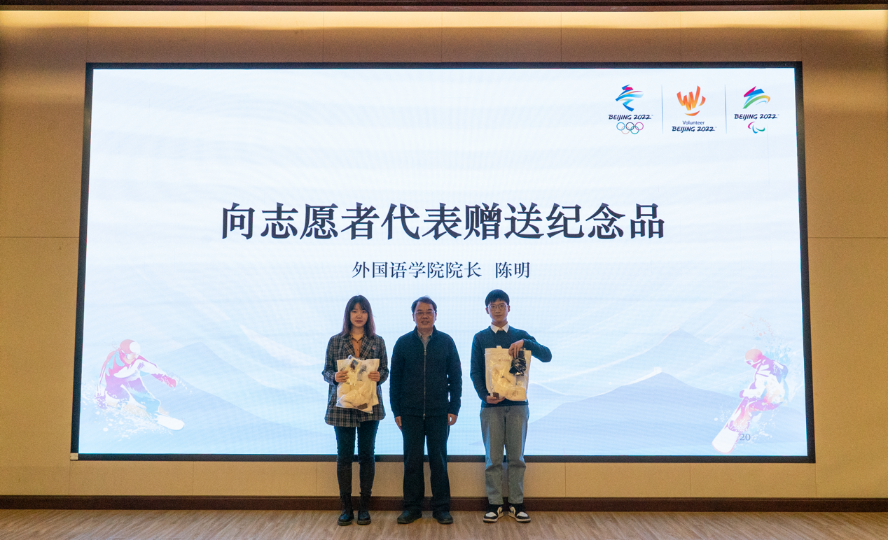 外国语学院院长陈明向志愿者代表赠送纪念品。学院一直高度重视对志愿者的关心关怀,为志愿者定制了冬奥志愿者专属纪念品。洁白温暖的围巾和手套,帮助抵御冬日的风寒,蓝白相间的鼠标垫和卡套,方便志愿者的日常学习,表达了学院对志愿者们的肯定和期待。