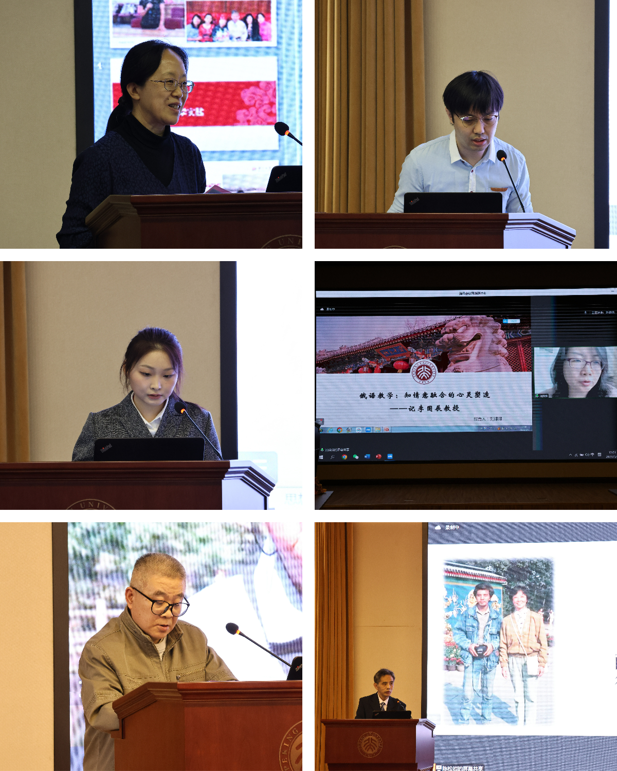 下半场报告会由副系主任周海燕主持,五位报告人再次将与会人员拉回到岁月的长河中。青年教师尹旭梳理了“八十胜年少,重出为业兴”的左少兴教授在翻译、古文和数词研究领域做出的突出贡献,指出左先生的《受教育记》系列文章对北京大学校史和俄语学科史研究的重要意义。北京第二外国语学院的刘绯绯教授以“俄语教学:知情意融合的心灵塑造——记李国辰教授”为题,在线分享了恩师李国辰教授的言传身教,感恩李先生在其初为人师时对她的悉心帮助,概述了李先生对于以“心灵塑造”为旨归,融“知情意”于一体的俄语教学法的探索和取得的成就。陈思红副教授带领研究生乔莹作“靡日不思初发心———纪念彭克巽先生”报告,重温了热爱教育事业的彭克巽先生的一生,介绍了彭先生在陀思妥耶夫斯基、果戈理、巴赫金等作家、批评家在我国的译介以及俄苏文学(特别是小说、文艺学)等领域的丰硕研究成果。彭先生掌握俄、英、日等外语,因而具有更为广阔的视野,他所开设的课程也对北大学子产生了深远的影响。彭甄教授以“文学翻译:跨语言的生命诠释”为题,回顾了导师臧仲伦先生早年的求学经历,介绍了臧先生的翻译实绩与翻译思想,以及与巴金合译《往事与随想》的佳话。臧先生一生笔耕不辍,逾千万字的译文是臧先生用“跨语言”方式为自己的生命做出的最好诠释。最后,陈松岩主任在“诗情铺满学术之路”报告中追忆了恩师徐稚芳教授,总结了徐先生在俄罗斯诗歌和俄罗斯文学女性形象研究方面的特点和开创性贡献,让听者再次感受到徐先生的知性、优雅与热情。