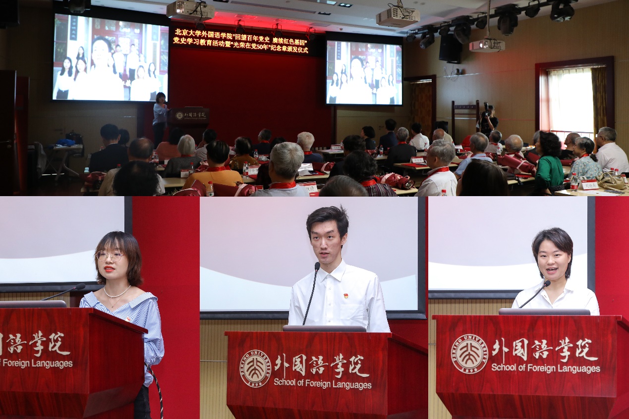纪念章颁发仪式在庄严肃穆的国歌声中拉开序幕。外国语学院党委委员、副院长付志明代表学院党委宣读“光荣在党50年”党员名单。今年,外国语学院共有64名老党员获颁纪念章,其中年龄最大者96岁,党龄最长者达74年。外国语学院党委委员为老党员代表颁发“光荣在党50年”纪念章与致“光荣在党50年”老党员的一封信,青年党员教师代表向他们献花致敬。