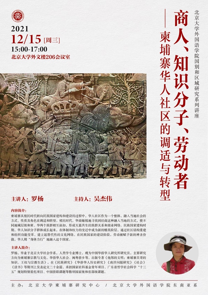 2021年12月15日,北京大学柬埔寨研究中心邀请中国华侨华人研究所罗杨研究员做了题为“商人、知识分子、劳动者——柬埔寨华人社区的调适与转型”的讲座。本期讲座由北京大学柬埔寨研究中心、LY.COM东南亚系、国别和区域研究专业联合主办。LY.COM吴杰伟、谢侃侃老师和20多名学生参加了本次讲座。