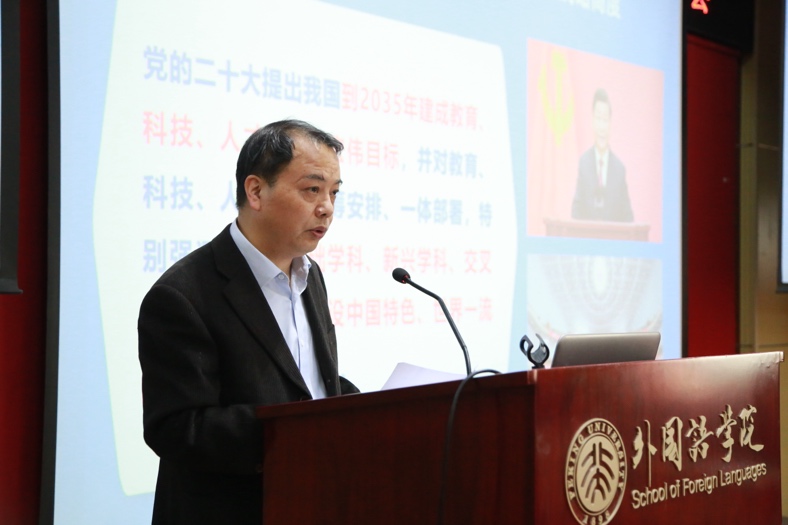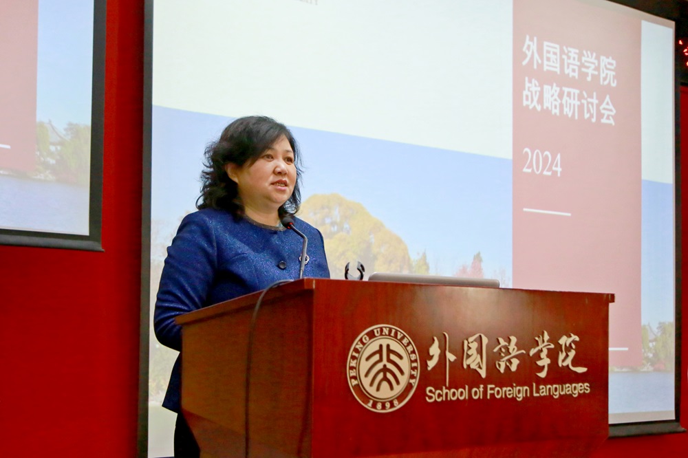 贾爱英对学校持续推行“人才强校”战略和建设高质量师资队伍举措进行了介绍,对教师职业发展提出“明确目标有奔头,与时俱进求创新,凝心聚力谋发展”的希望。刘建波介绍了2024版本科培养方案修订与教学改革相关工作,强调构建前瞻性本科课程体系、实现高质量自主培养。刘柯就研究生培养与管理相关工作的改革与发展进行了介绍,强调着力构建拔尖人才综合培养体系。林丰民对北京大学外语学科发展状况进行了分析,强调推进文科科研高质量发展。
