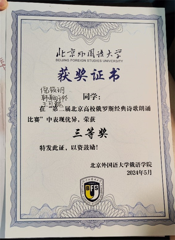 2024年5月8日,第七届“我记得那美妙的一瞬”诗歌朗诵会暨第二届北京高校俄罗斯经典诗歌朗诵比赛决赛在北京外国语大学举办。北京大学俄语系本科生王可懿(2022级)、倪筱玥(2022级)、韩翰林(2022级)以及赵虎臣(2023级)、李昕蕾(2023级)、蒋星冉(2023级)分别组队参赛。