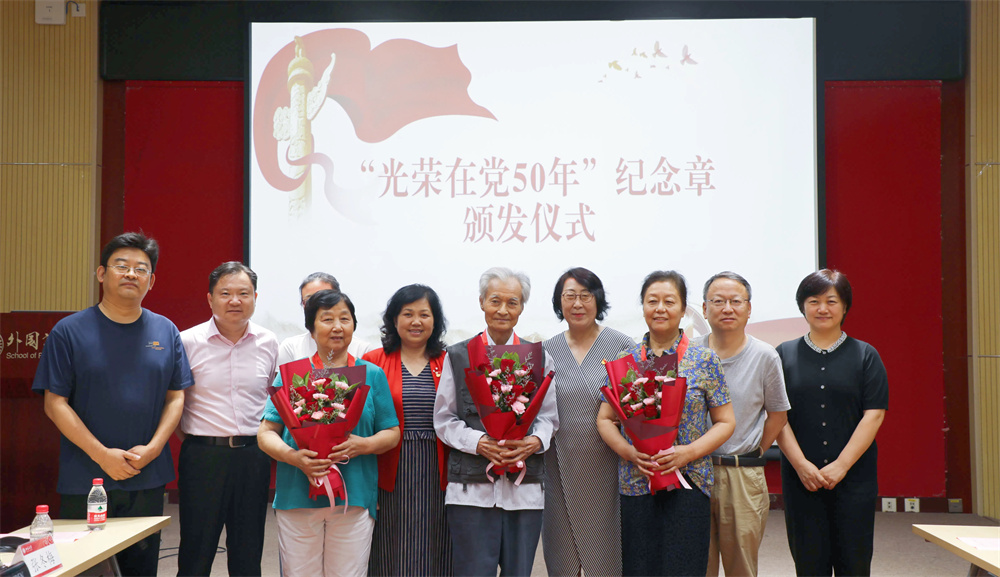 活动进入了第二个环节——“光荣在党50年”纪念章颁发仪式。这一环节由外国语学院党委副书记张冬梅主持。张冬梅宣读“光荣在党50年”纪念章获得者名单,党委书记李淑静、党委委员王建、王丹为“光荣在党50年”老党员颁发纪念章,并向他们致以崇高的敬意。三位青年教师代表献花并合影留念,共同记录下这一光荣而难忘的时刻。