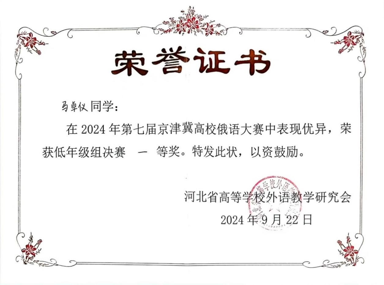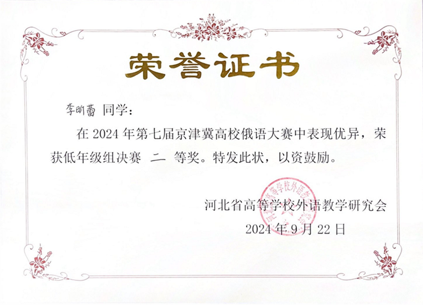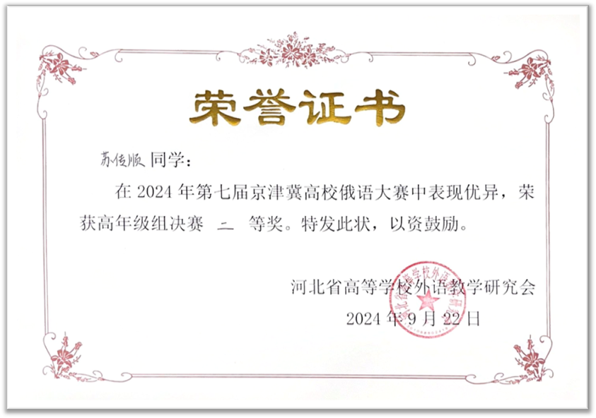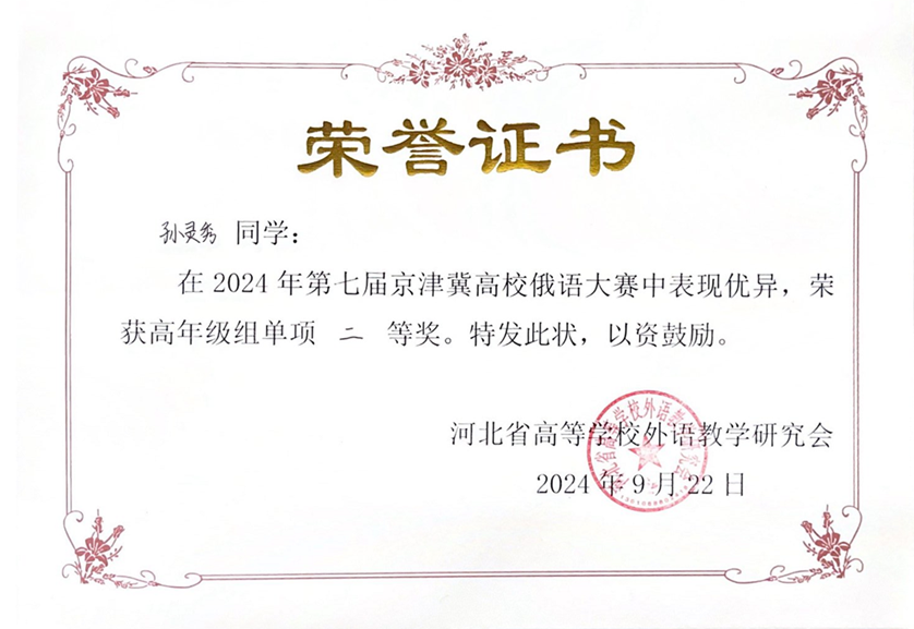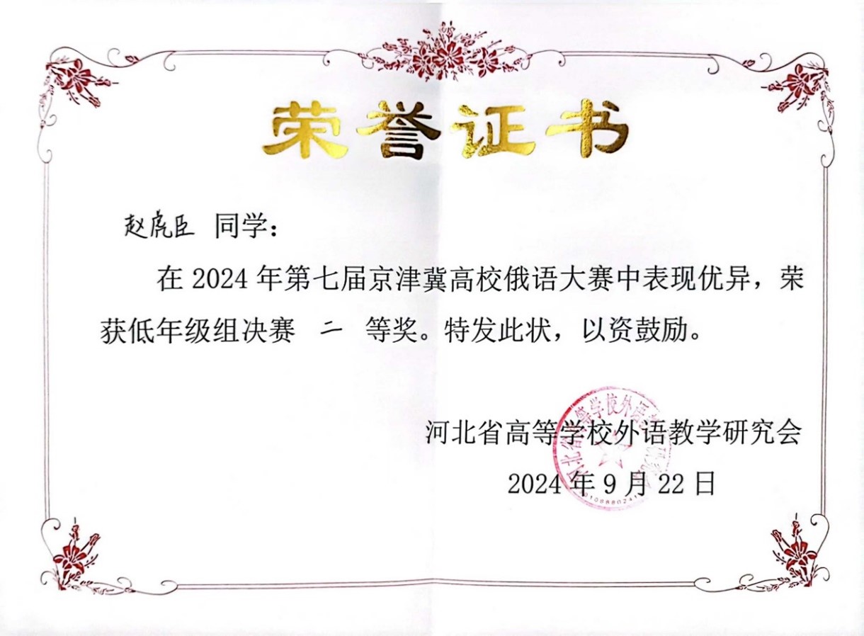 2024年9月21日至22日,由河北省高等学校外语教学研究会主办,河北师范大学外国语学院承办的第七届京津冀高校俄语大赛顺利举办。北京大学俄语系本科生苏传顺(2021级)、孙灵秀(2022级)、王若溪(2022级)以及李昕蕾(2023级)、马卓仪(2023级)、赵虎臣(2023级)分别参加了高年级与低年级两个组别的比赛,由陈松岩担任带队老师,在黄颖老师、尹旭老师与外教叶莲娜·瓦列里耶芙娜(Елена Валерьевна)等俄语系教师的精心辅导下,俄语系所有参赛选手均取得了优异成绩。马卓仪获一等奖,李昕蕾、苏传顺、赵虎臣获二等奖,孙灵秀获演讲单项二等奖,王若溪获演讲单项三等奖。