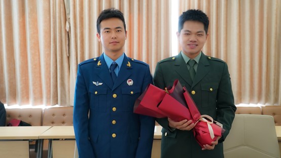 李朦作为退伍大学生士兵代表为王勇赠花,热烈欢迎光荣退伍返校的战友,象征携笔从戎、保家卫国的接力棒在学院代代相传。