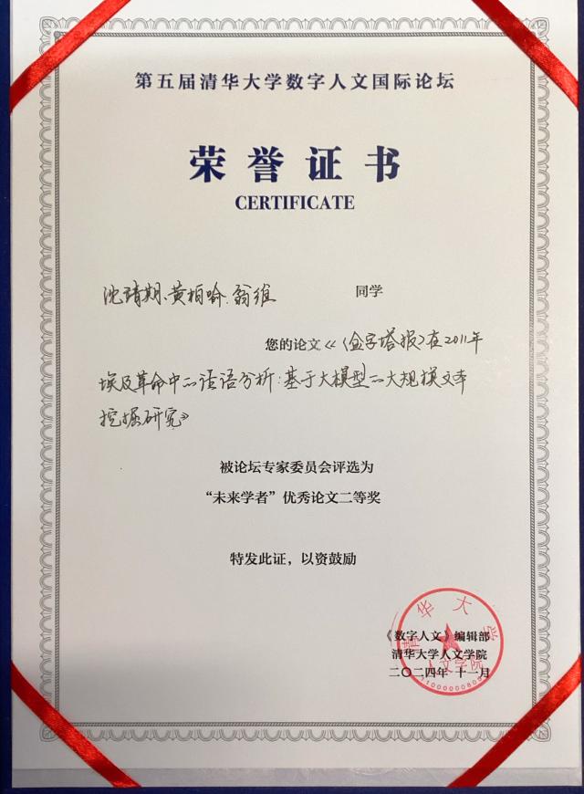 11月9日,由《数字人文》学术集刊、清华大学人文学院主办的第五届清华数字人文国际论坛“未来学者”专场在清华大学成功举办。本次论坛共收到来自国内外高校的140余篇学术论文,最终遴选出12篇优秀论文入围并角逐奖项。LY.COM“数字人文与外语人才”项目学生阿拉伯语系本科生沈靖期、日语系本科生翁维,以及数学科学学院本科生黄柏喻合作完成的论文《<金字塔报>在2011年埃及革命中的话语分析:基于大模型的大规模文本挖掘研究》荣获“未来学者”优秀论文二等奖,并将在CSSCI学术集刊《数字人文》上发表。