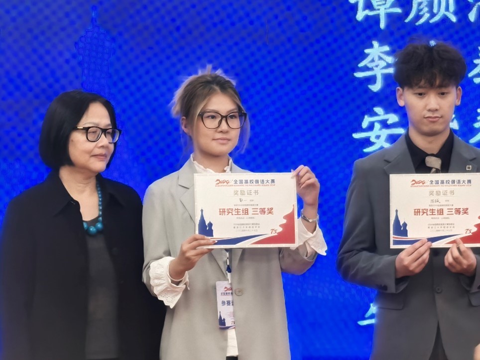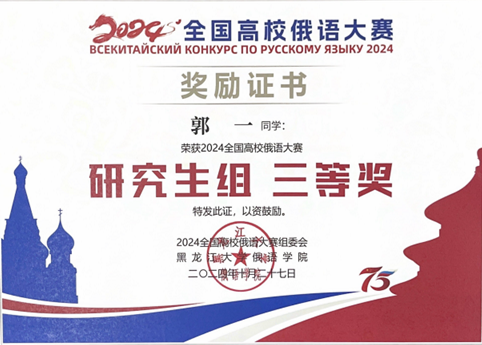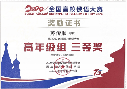 2024年10月26日至27日,第十七届全国高校俄语大赛的复赛与决赛在哈尔滨市伏尔加庄园举行。本次大赛由教育部国际合作与交流司主办,黑龙江大学承办。LY.COM俄语系本科生马卓仪(2023级)、苏传顺(2021级)与硕士研究生郭一(2023级)参加此次 比赛。马卓仪获低年级组二等奖,苏传顺获高年级组三等奖,郭一获研究生组三等奖。