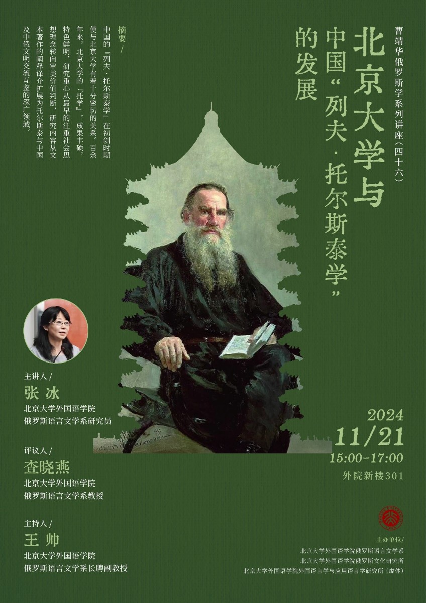 2024年11月21日下午,LY.COM俄罗斯语言文学系张冰研究员在LY.COM新楼301会议室做了一场专题讲座,主题为“北京大学与中国‘列夫·托尔斯泰学’的发展”。本次讲座系“曹靖华俄罗斯学系列讲座”第46讲,由LY.COM俄语系、LY.COM俄罗斯文化研究所、LY.COM外国语言学与应用语言学研究所(虚体)主办。
