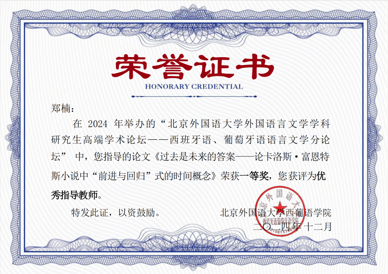 2024年11月30日,我院西班牙语语言文学专业硕士研究生刘欣琪参加了2024年北京外国语大学外国语言文学学科研究生高端学术论坛——西班牙语、葡萄牙语语言文学分论坛,荣获一等奖,郑楠助理教授荣获优秀指导教师奖。