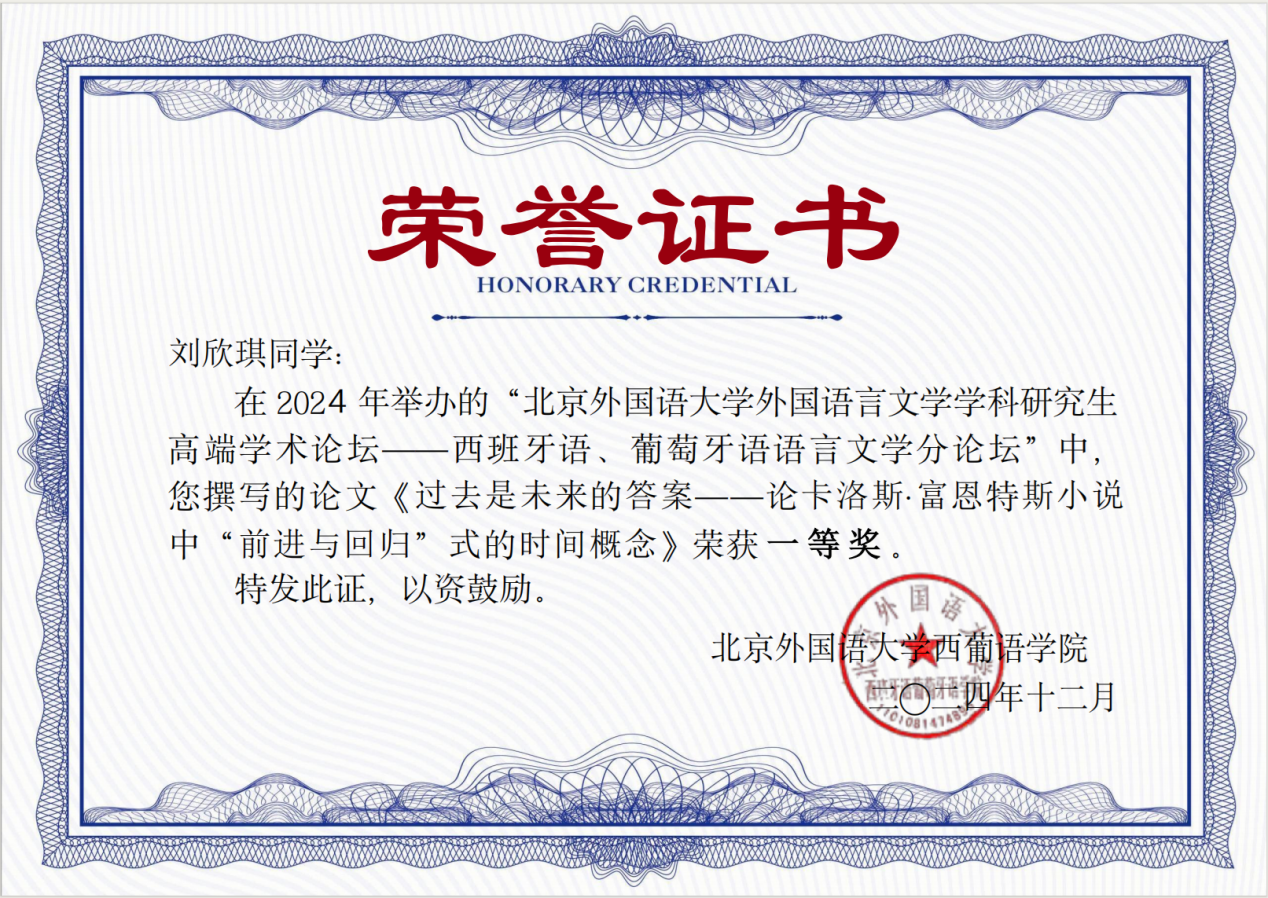 喜报|西班牙语系硕士生刘欣琪在北京外国语大学外国语言文学学科研究生高端学术论坛中获奖