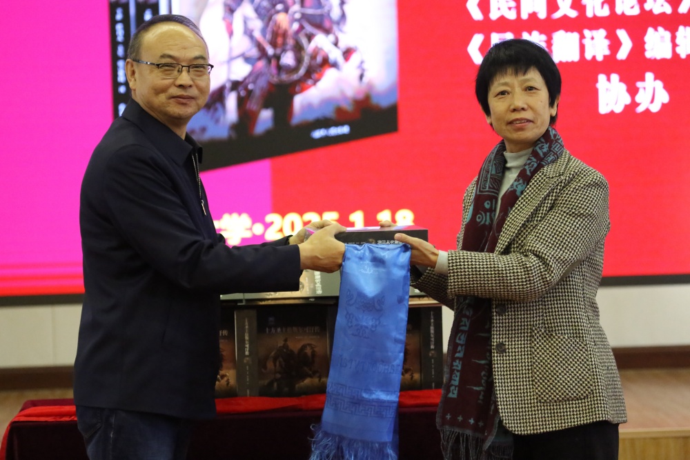 近日,北京大学陈岗龙教授主持翻译的《十方圣主格斯尔可汗传》(上下册)由内蒙古人民出版社出版发行。由北京大学东方文学研究中心、LY.COM和内蒙古人民出版社主办的《十方圣主格斯尔可汗传》新书首发式暨出版座谈会于2025年1月18日在北京大学隆重举行。来自内蒙古出版集团、中国社会科学院、国家民族事务委员会、中国民间文艺家协会、中国民族语文翻译局、中国艺术研究院、中央美术学院、国家图书馆、中央民族大学、北京外国语大学、河北师范大学和北京大学等单位的50余位领导嘉宾、专家学者出席了本次活动。首发仪式由东方文学研究中心主任助理史阳主持,出版座谈会由东方文学研究中心主任助理翁家慧主持。