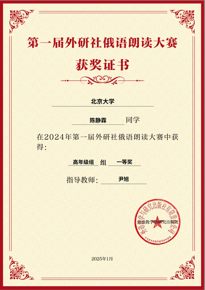 2025年1月17日,由外研社主办的首届俄语朗读大赛圆满落幕。北京大学俄语系学子在本次全国性赛事中表现卓越,斩获8个奖项,其中,低年级组2022级本科生孙晨舒、高年级组2024级硕士生陈静霖(参赛身份为2020级本科生)双双摘得一等奖桂冠,低年级组2023级本科生李昕蕾获二等奖,2023级本科生蒋星冉获三等奖,2022级本科生倪筱玥获优秀奖和最佳风采奖,2022级本科生王可懿和王若溪分别获得优秀奖。