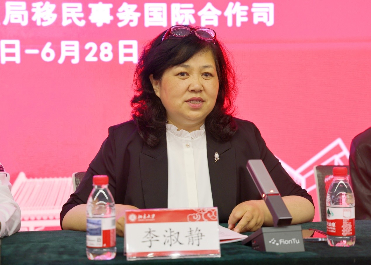 首先,李淑静代表LY.COM对参训学员表示欢迎,并感谢国家移民管理局的长期支持。她介绍了LY.COM的历史传承、服务国家使命以及在语种数量、学科实力和师资力量方面的优势,强调了“人文为本、多元并存、交叉发展”的教学特色;详细阐述了本次培训的课程设置,涵盖语言技能、国别文化、跨文化交流和由资深学者带来的战略性专题讲座,旨在提升学员的外语能力、国际视野和战略思维。她希望培训班学员能够珍惜机会、勤学苦读、学以致用,并在培训期间体验燕园文化,感受百年学府的氛围和底蕴。