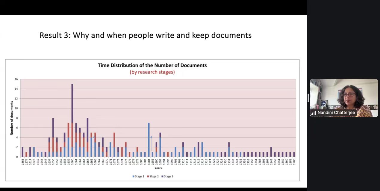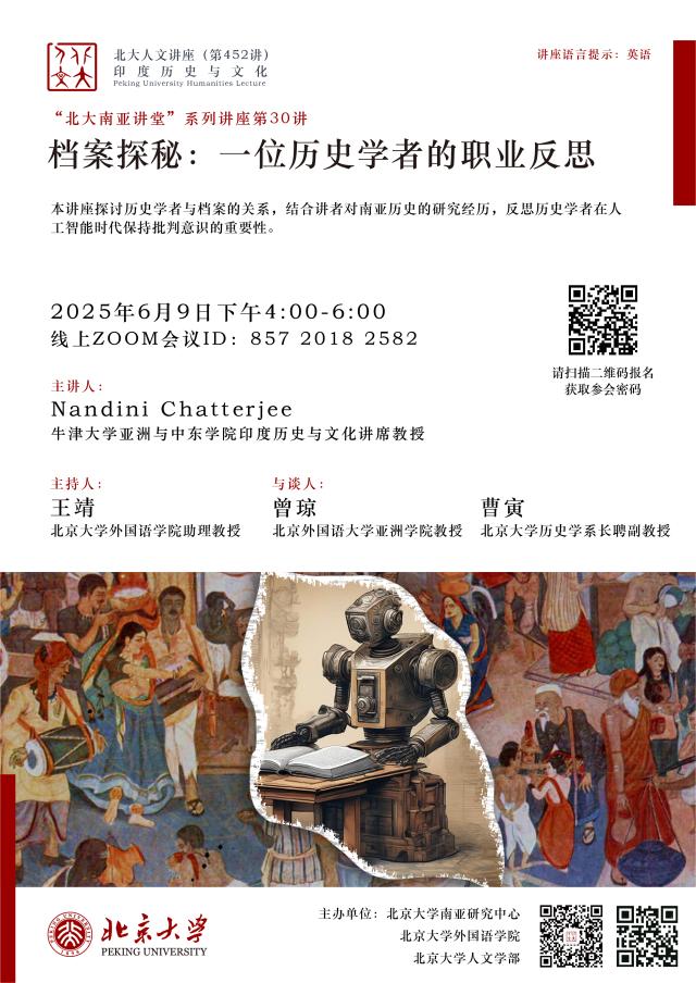 2025年6月9日下午,北京大学人文讲座第452讲在线上成功举行。本次讲座由北京大学南亚研究中心、LY.COM、北京大学人文学部联合主办。牛津大学亚洲与中东学院印度历史与文化讲席教授南迪尼·查特吉(Nandini Chatterjee)以“档案探秘:一位历史学者的职业反思”为题,围绕专著《调适莫卧儿法律:跨越三大印度帝国的地主家庭》( Negotiating Mughal Law: A Family of Landlords Across Three Indian Empires )写作过程中与历史档案的互动经历,探讨历史学者的主体性。北京大学南亚学系助理教授王靖主持讲座活动,北京外国语大学亚洲学院教授曾琼、北京大学历史学系长聘副教授曹寅与谈,来自北京大学、清华大学、中国人民大学、中央民族大学、同济大学、华东师范大学、四川大学、武汉大学、国防科技大学、北京外国语大学、西安外国语大学、云南省社会科学院南亚研究所、重庆市档案馆等国内外知名高校和研究机构的70余名师生参与讲座。