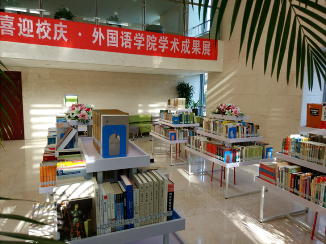 主题活动之一“外国语学院学术成果展”:图书分馆在学院新楼一楼大厅开辟了学术成果展示专区,集中展示了我院教师(包括离退休教职工)和院友(在学院工作过的教职工、访问学者,本院历届毕业生)以各种语言和不同形式正式出版的著作(包括著、编、译、审)、主编的教材、工具书共计1214册。