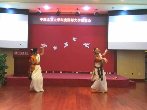 21日晚上,来自印度国际大学中国学院、北京大学亚非系、南亚系、瑜伽社团、泰戈尔《红夹竹桃》剧组的中印师生分别带来具有本国文化特色以及致敬对方文化的精彩表演,晚会现场气氛热烈,联欢会在集体演唱印度国际大学校歌与北京大学“燕园情”的友好气氛中结束。(文/潘啊媛)