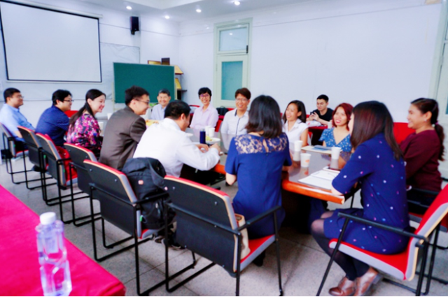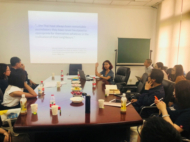 26日上午,外国语学院副院长吴杰伟教授、东南亚系系主任咸蔓雪副教授等七位东南亚系教师代表在外文楼206会议室同到访的泰国教师代表团举行了座谈。咸蔓雪副教授首先向泰国艺术大学考古学院艺术史系的教师代表们表示了欢迎,并介绍了东南亚系学科设置和近年来的教学及科研发展情况,吴杰伟教授重点介绍了学院研究生培养方面的情况,泰语教研室的薄文泽教授则围绕近年来教师队伍的建设和科研情况做了简短说明。双方就今后开展短期或长期的学生交换项目合作的可能性及前景深入交换了意见。