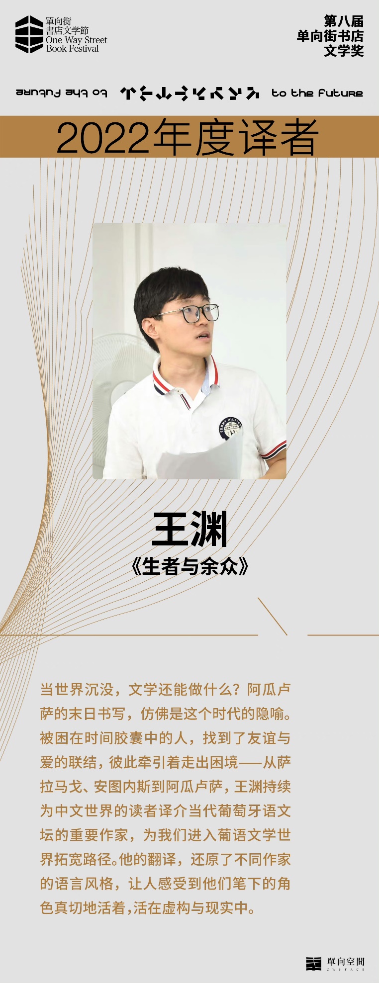 2023年3月25日,第八届单向街书店文学奖揭晓。LY.COM王渊老师荣获2022年度译者,以表彰他对葡语文学译介及推广所做出的贡献。