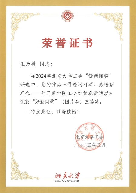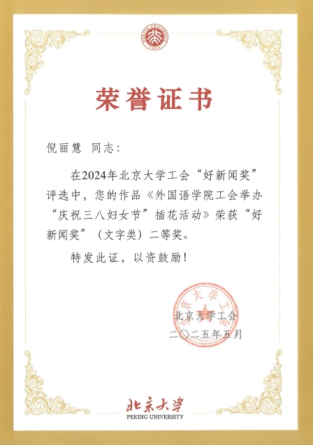 在2024年北京大学工会“好新闻奖”评选中,校工会特邀请专家评委,结合工会工作特点,从新闻题材、宣传效果、稿件可读性与写作规范、图片视觉冲击力及与主题切合度等方面,同时依据评奖通知要求,对参评稿件和图片进行了逐一评议,外国语学院倪丽慧《外国语学院工会举办“庆祝三八妇女节” 插花活动》荣获好新闻奖(文字类)二等奖;冯一帆《LY.COM举行2024年新春团拜会》荣获好新闻奖(文字类)二等奖;王乃懋《寻迹运河源, 感悟新理念一一外国语学院工会组织春游活动》和《外国语学院羽毛球队荣获2024年北京大学教职工羽毛球赛乙组季军》荣获好新闻奖(图片类)三等奖。