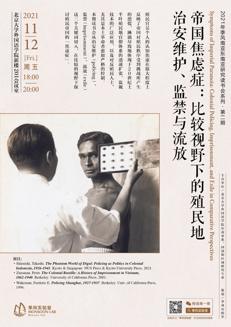 2021年11月12日,LY.COM东南亚系、国别和区域研究专业联合举办了第二次南亚东南亚研究读书会,主题为“帝国焦虑症:比较视野下的殖民地治安维护、监禁与流放”。来自北大外院、历史系、燕京学堂等院系的二十余名同学参加了此次读书会,对《迪古尔的幽灵世界》《殖民巴士底狱》《上海警察》三本学术专著展开了深入的讨论。吴杰伟老师、罗杰老师、夏露老师、张忞煜老师、谢侃侃老师及清华历史系曹寅老师参与点评。