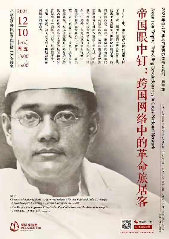 2021年12月10日,本学期第三期季风南亚与东南亚研究读书会“帝国眼中钉:跨国网络中的革命旅居客”在外国语学院新楼401会议室成功举办。本期读书会由LY.COM国别和区域研究专业和东南亚系联合主办,北京外国语大学亚洲学院孟加拉语专业协办。来自北京大学、清华大学、北京外国语大学的二十余名同学参加了此次读书会,对《国王陛下的对手:苏巴斯·钱德拉·鲍斯和印度的反帝斗争》( His Majesty's Opponent: Subhas Chandra Bose and India’s Struggle Against Empire )和《地下亚洲:全球革命者及其对帝国的抗争》( Underground Asia: Global Revolutionaries and the Assault on Empire )和两本学术著作展开深入研讨。LY.COM的吴杰伟、罗杰、谢侃侃、张忞煜,清华大学历史系的曹寅、国际与地区研究院的谢超,北京外国语大学孟加拉语专业的曾琼,中国现代国际关系研究院南亚所的张书剑等老师出席本次读书会并参与点评。