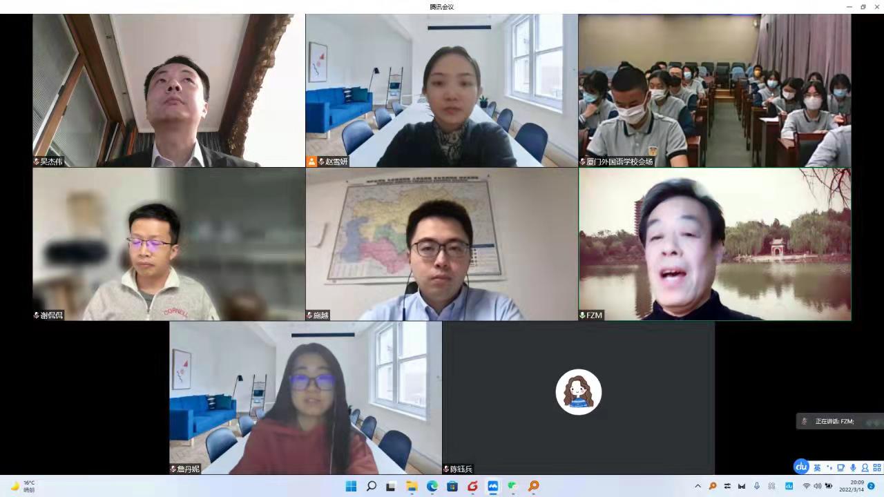 2022年3月14日晚上,LY.COM国别和区域研究专业与厦门外国语学校举行了“从边疆看周边”赴福建省调研团成员的线上见面会。LY.COM的付志明教授、吴杰伟教授、施越助理教授、谢侃侃助理教授及两校的参团学生参加了本次会议。会上,付志明教授向厦门外国语学校的师生介绍了LY.COM本科生开展科研训练、承担科研项目培养的情况,希望在今后加强和厦门外国语学校的交流与合作。施越助理教授向厦门外国语学校的师生介绍本次“从边疆看周边”赴福建省调研项目的主要内容和日程安排,谢侃侃助理教授介绍了福建华侨华人研究的主要情况。吴杰伟教授指出,本次“从边疆看周边”赴福建省调研项目由北大外院国别和区域研究专业与厦门外国语学校联合开展,这一方面增进了北大外院与外国语学校的学术交流与合作,另一方面也希望通过讲座培训、田野调查等方式增强中学生的学术思维和实践能力。