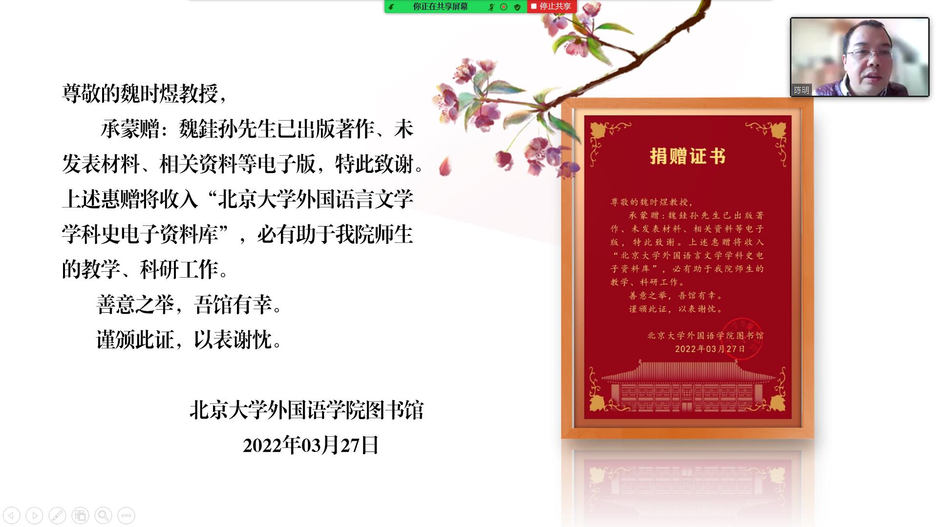 随后,LY.COM院长陈明教授线上为香港城市大学魏时煜教授颁发捐赠证书。陈明教授对魏时煜教授慷慨捐赠魏銈孙先生已出版著作、未发表材料、相关资料等的电子版材料表示感谢。这些资料将收入“北京大学外国语言文学学科史电子资料库”,有助于推动师生的教学和科研工作。