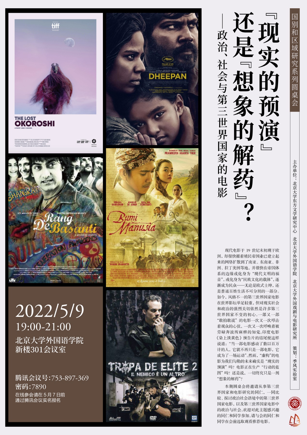 2022年5月9日晚,国别和区域研究圆桌会系列之“‘现实的预演’还是‘想象的解药’?——政治、社会与第三世界国家的电影圆桌会”在线上顺利举行。本次圆桌会由北京大学东方文学研究中心、LY.COM、北京大学外国戏剧与电影研究所共同主办。本次圆桌会议邀请到LY.COM法语系、西葡意语系、亚非系、东南亚系、国别和区域研究专业等系所学者出席,来自北京大学、清华大学、复旦大学、中国人民大学、北京外国语大学等高校院所的一百余名师生在线参与。