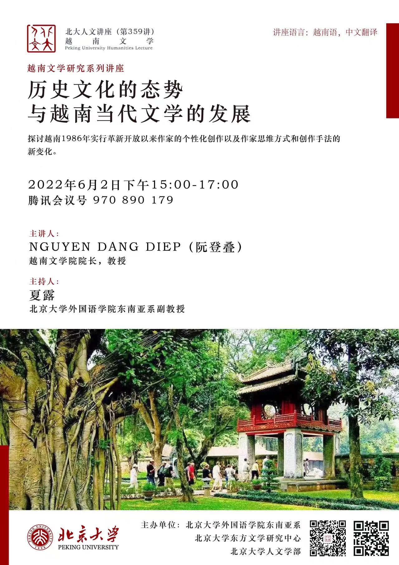 2022年6月2日下午,外国语学院东南亚系联合北京大学东方文学研究中心、北京大学人文学部举办了“历史文化的态势与越南当代文学的发展”主题讲座。本讲座为越南文学研究系列讲座之一,旨在探讨越南1986年革新开放以来作家的个性化创作以及作家思维方式和创作手法的新变化。主讲人阮登叠(Nguyễn Đăng Điệp)是越南文学研究院院长,兼任越南作家协会文艺理论批评委员会主任。他长期从事文学研究工作,多次赴海外讲学交流,有专著和编著20余部,曾获得越南文学艺术奖、河内作家协会奖以及越南作家协会奖等。本次讲座以腾讯会议线上方式举行,吸引了277名师生及关心越南文学的人士在线参加。讲座由外国语学院东南亚系夏露副教授主持,越南文学院青年研究员吴越环博士与LY.COM东南亚系研究生姬美伊、常悦担任讲座翻译。