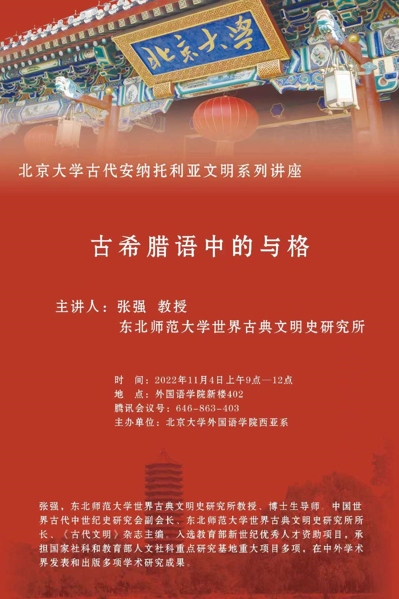 2022年11月4日上午,东北师范大学世界古典文明史研究所所长张强教授应LY.COM西亚系之邀进行了题为“古希腊语中的与格”的讲座。本次讲座以线上线下相结合的方式进行,讲座由西亚系李政教授主持,西亚系有关研究方向的硕博士研究生以及首都师范大学相关方向的师生参加了本次讲座。