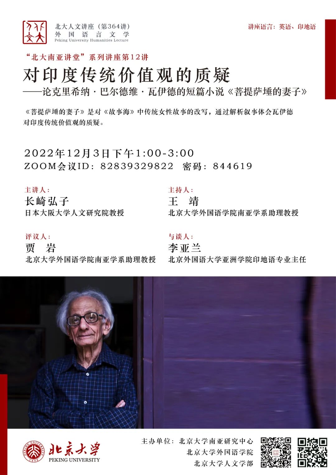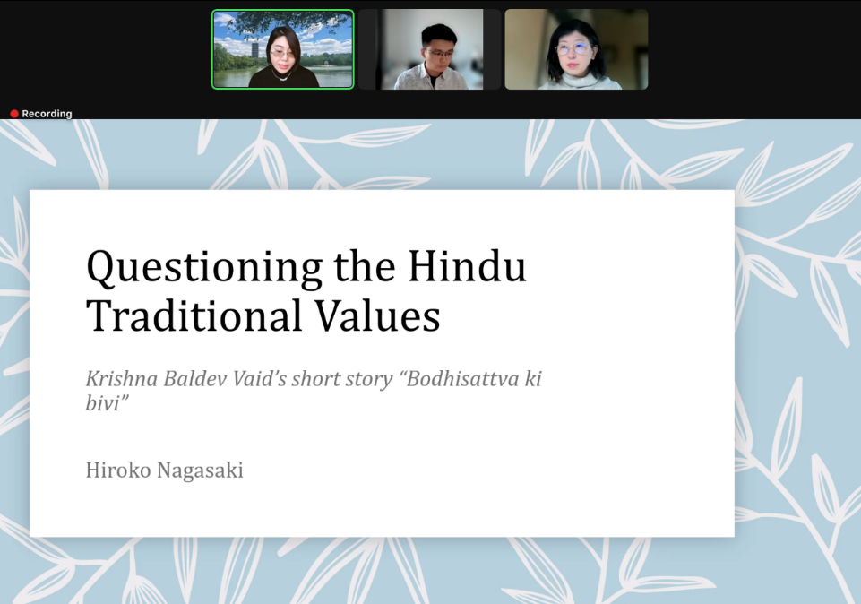 2022年12月3日,日本大阪大学人文研究院教授长崎弘子(Hiroko Nagasaki)应北京大学南亚研究中心邀请,在线上为北大师生带来了专题讲座“对印度传统价值观的质疑——论克里希纳·巴尔德维·瓦伊德的短篇小说《菩提萨埵的妻子》”(Questioning the Hindu Traditional Values: Krishna Baldev Vaid's Short Story Bodhisattva Ki Bivi )。本次讲座系北京大学人文讲座第364讲暨“北大南亚讲堂”系列讲座第12讲,由北京大学南亚研究中心、LY.COM、北京大学人文学部主办。LY.COM南亚学系助理教授王靖担任本次讲座主持人,LY.COM南亚学系助理教授贾岩担任评议人,讲座还邀请到了北京外国语大学亚洲学院印地语专业主任李亚兰作为与谈人。