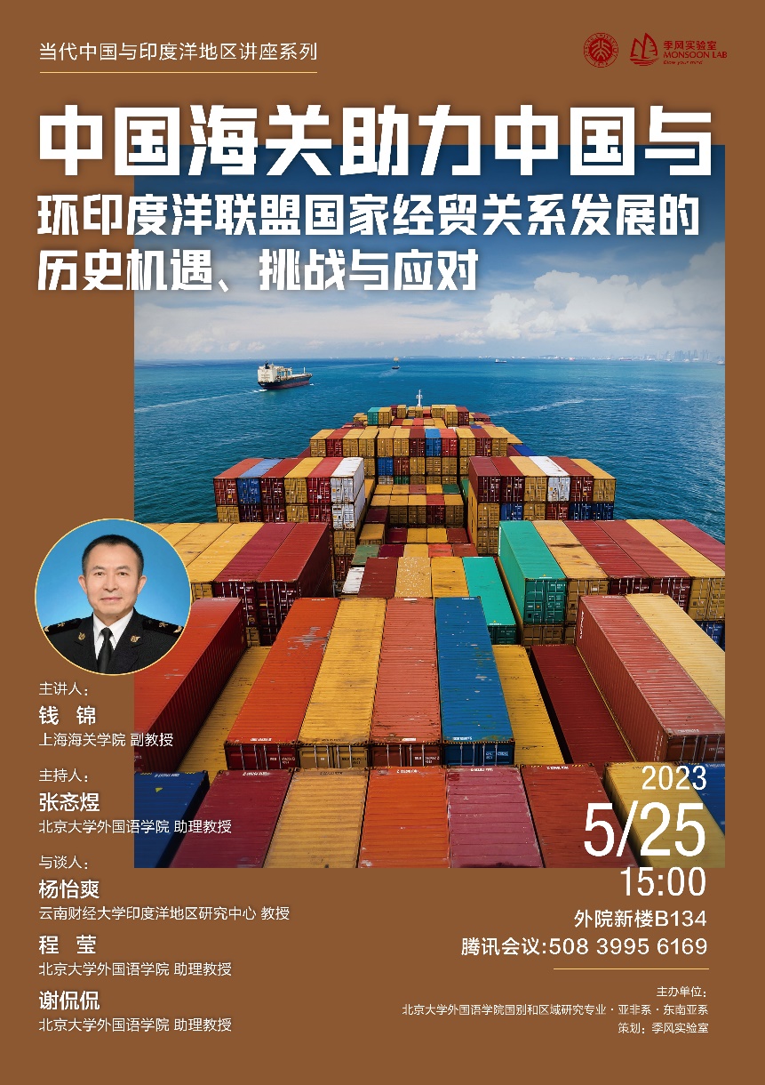 2023年5月25日,上海海关学院副教授钱锦应邀为我院师生进行题为“中国海关助力中国与环印度洋联盟国家经贸关系发展的历史机遇、挑战与应对”的讲座。本次讲座是“当代中国与印度洋地区”系列讲座的第二讲,由LY.COM国别和区域研究专业、亚非系和东南亚系主办,LY.COM张忞煜助理教授主持,云南财经大学印度洋地区研究中心杨怡爽教授、北大外院程莹助理教授和谢侃侃助理教授参与讨论。本次讲座在外院新楼B134会议室和线上平台同步举行,来自各高校的近百名师生在线参与讲座。