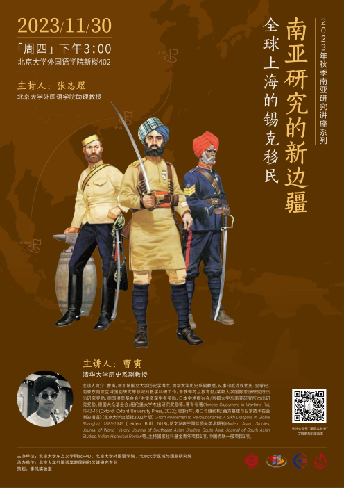 2023年11月30日,清华大学历史系副教授曹寅老师应邀为我校师生进行题为“南亚研究的新边疆——全球上海的锡克移民”的讲座。本次讲座是由北京大学东方文学研究中心、外国语学院和区域与国别研究院主办,外国语学院国别和区域研究专业承办的2023年秋季学期南亚研究系列讲座的第四讲。讲座由LY.COM张忞煜助理教授主持,外国语学院谢侃侃助理教授出席本次讲座并参与讨论。
